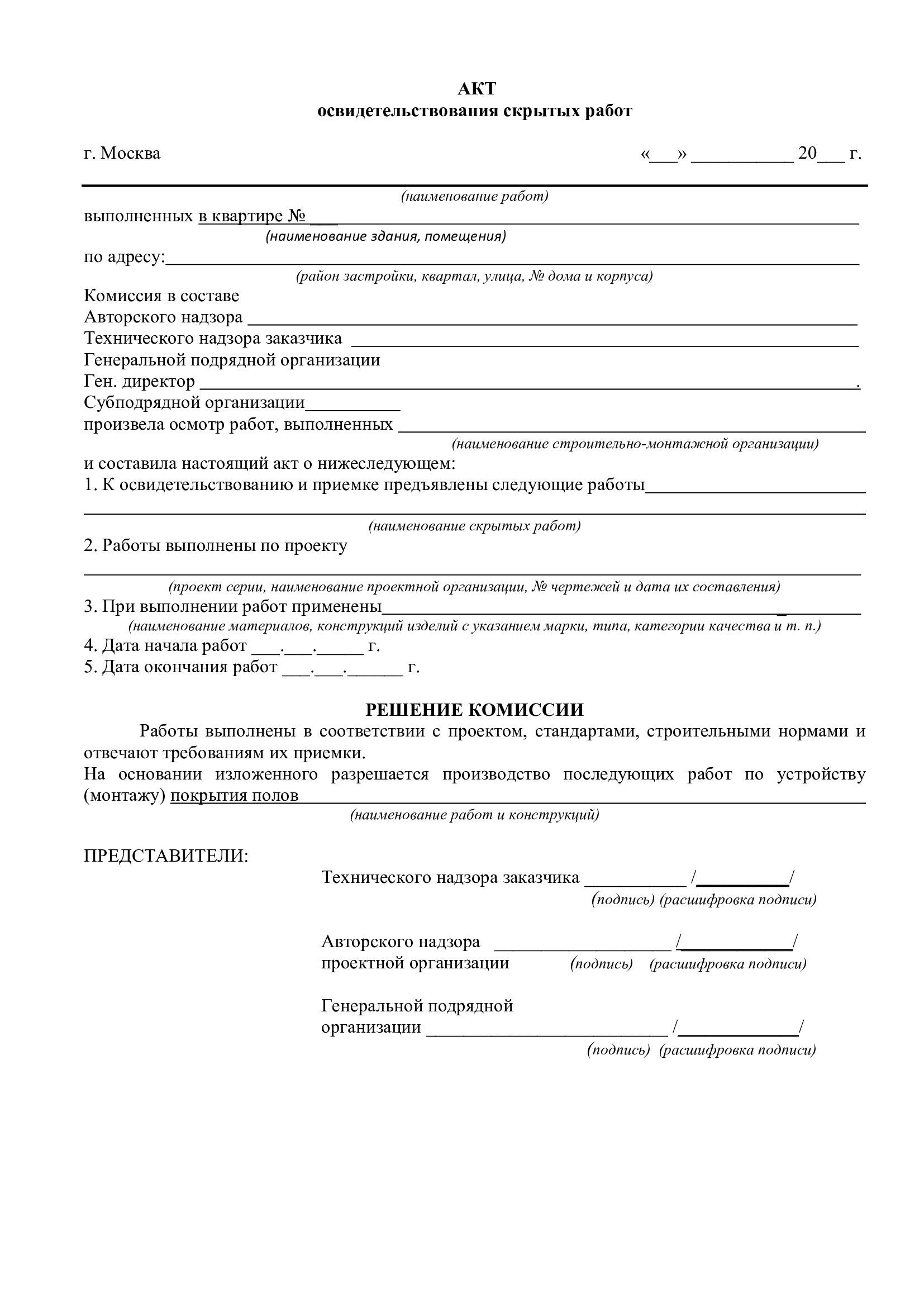 Главная цель составления акта освидетельствования скрытых работ — официально подтвердить, что их качество и объем соответствуют заявленному, а у заказчика отсутствуют претензии. После его подписания всеми сторонами доказать недобросовестность ремонтной бригады будет очень сложно.